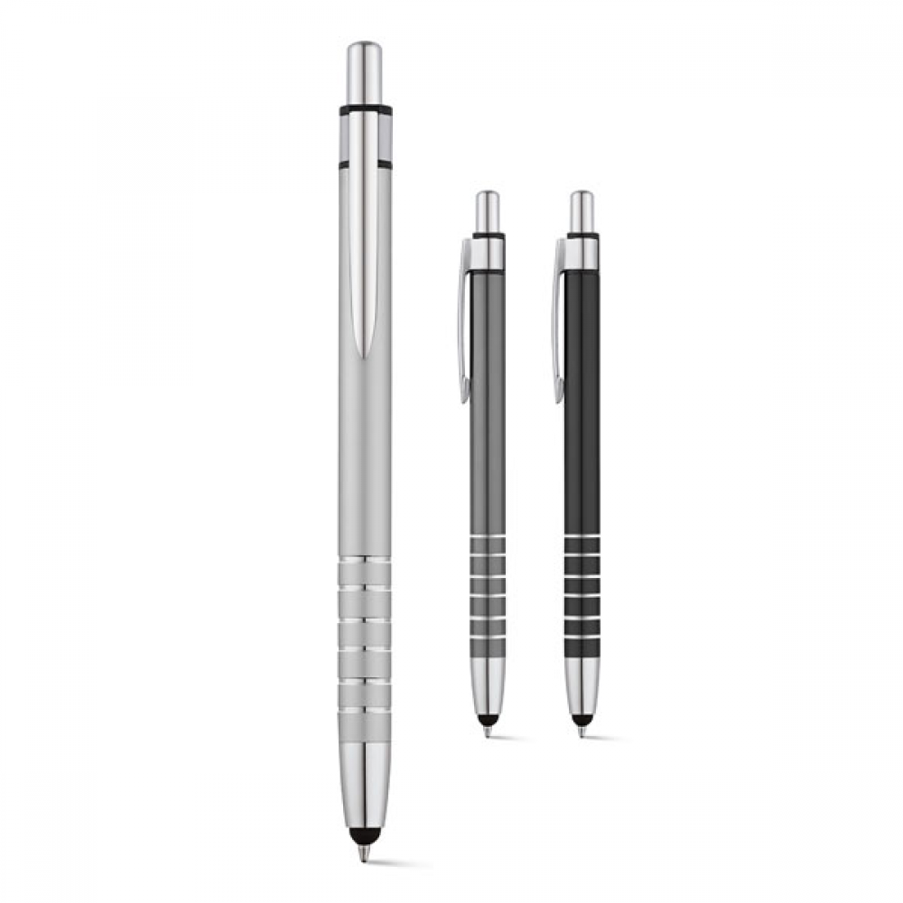 Esferográfica. Alumínio. Com ponteira touch. 1,5km de escrita.