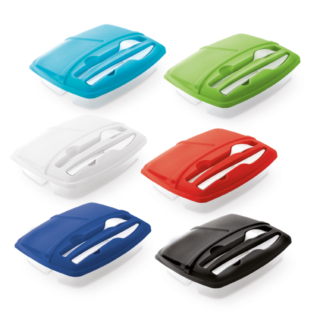 Marmita. PP. Com 3 compartimentos, garfo e faca. Capacidades: 250 ml, 270 ml e 470 ml. Apta para microondas (retirar a tampa). Food grade.